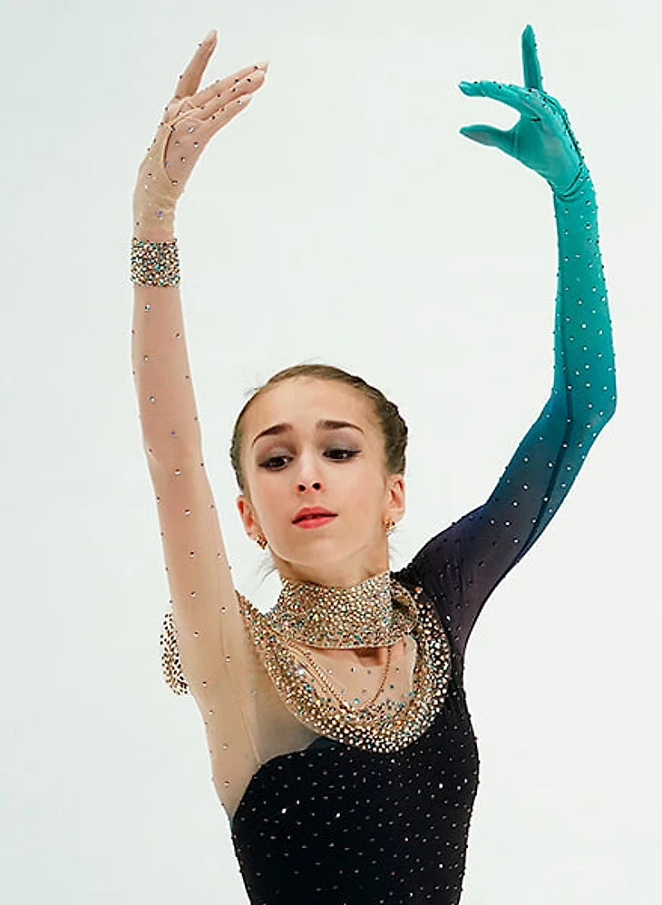 Такой ход можно было бы назвать находкой, если бы перед Косторной в Казани не выступала Валерия Шульская – еще одна фигуристка академии Плющенко: каталась в очень похожем платье, но с полноценным рукавом – прозрачным.