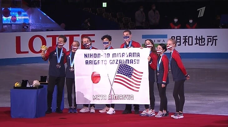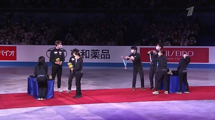 Первыми вышли японцы – после недолгой заминки фигуристы поняли, что надо делать, и под смех распределили медали. Американцы заняли второе место и разобрали серебро.