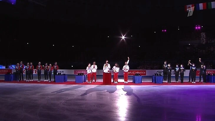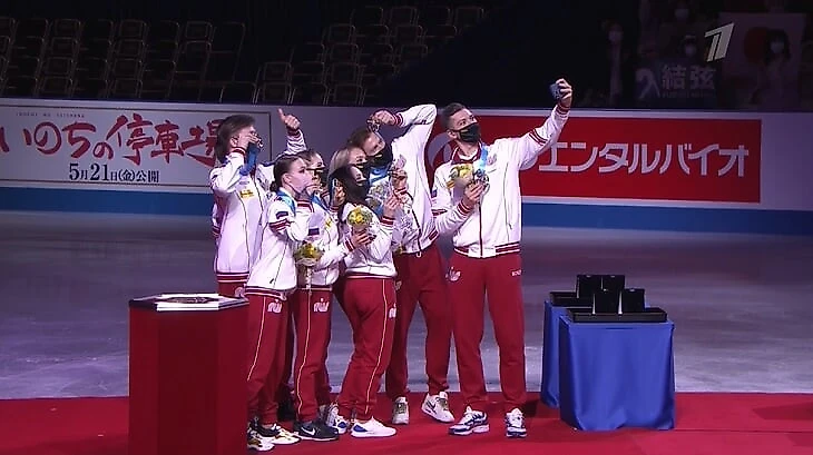 На командный турнир в Осаке ограничения не распространяются, поэтому фигуристы радостно встретили триколор и с упоением спели гимн – это было слышно (и видно), несмотря на маски.