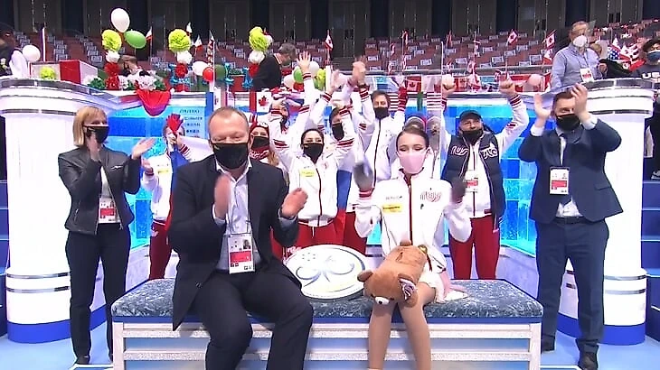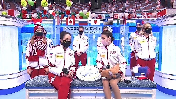 Остальная команда стояла за фигуристками в кисс-энд-край, где спортсменов разделяли прозрачные перегородки.