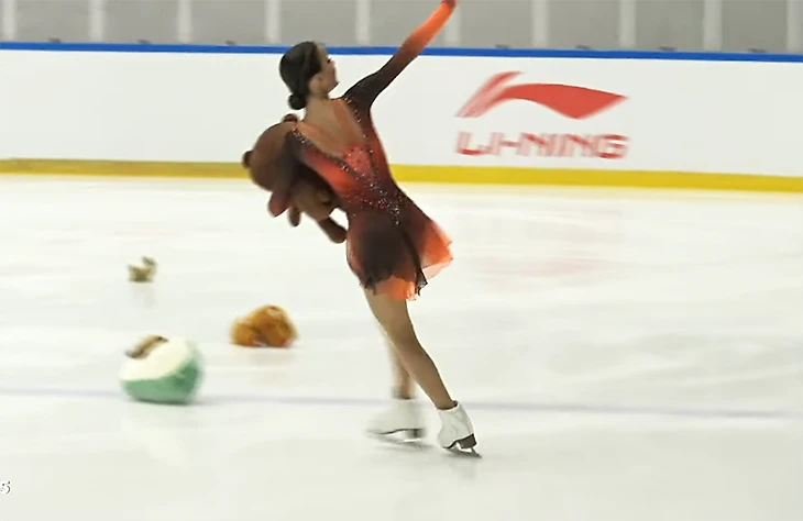Чемпионку мира явно заждались: самая плотная овация зала – именно ей, а лед после проката усыпан мягкими игрушками (эту традицию прерывали на ковидный сезон, но теперь вернули).