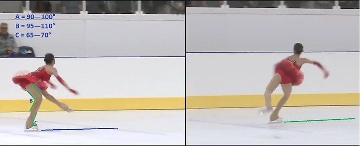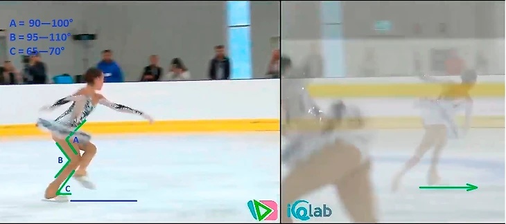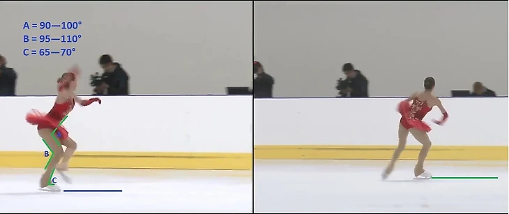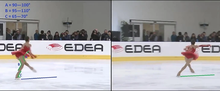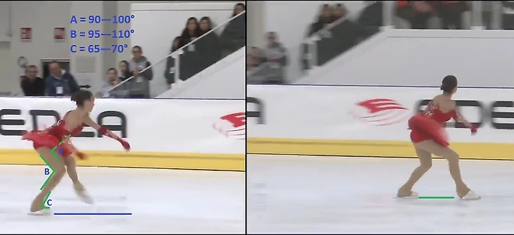 А вот это нам подходит. Потому что вполне возможно оценить на приземлении тот момент, когда опорная нога и туловище фигуриста образуют требуемые углы. Конечно, как следует из цитаты, такой метод подходит для прыжков, выполненных без явной ошибки на приземлении.