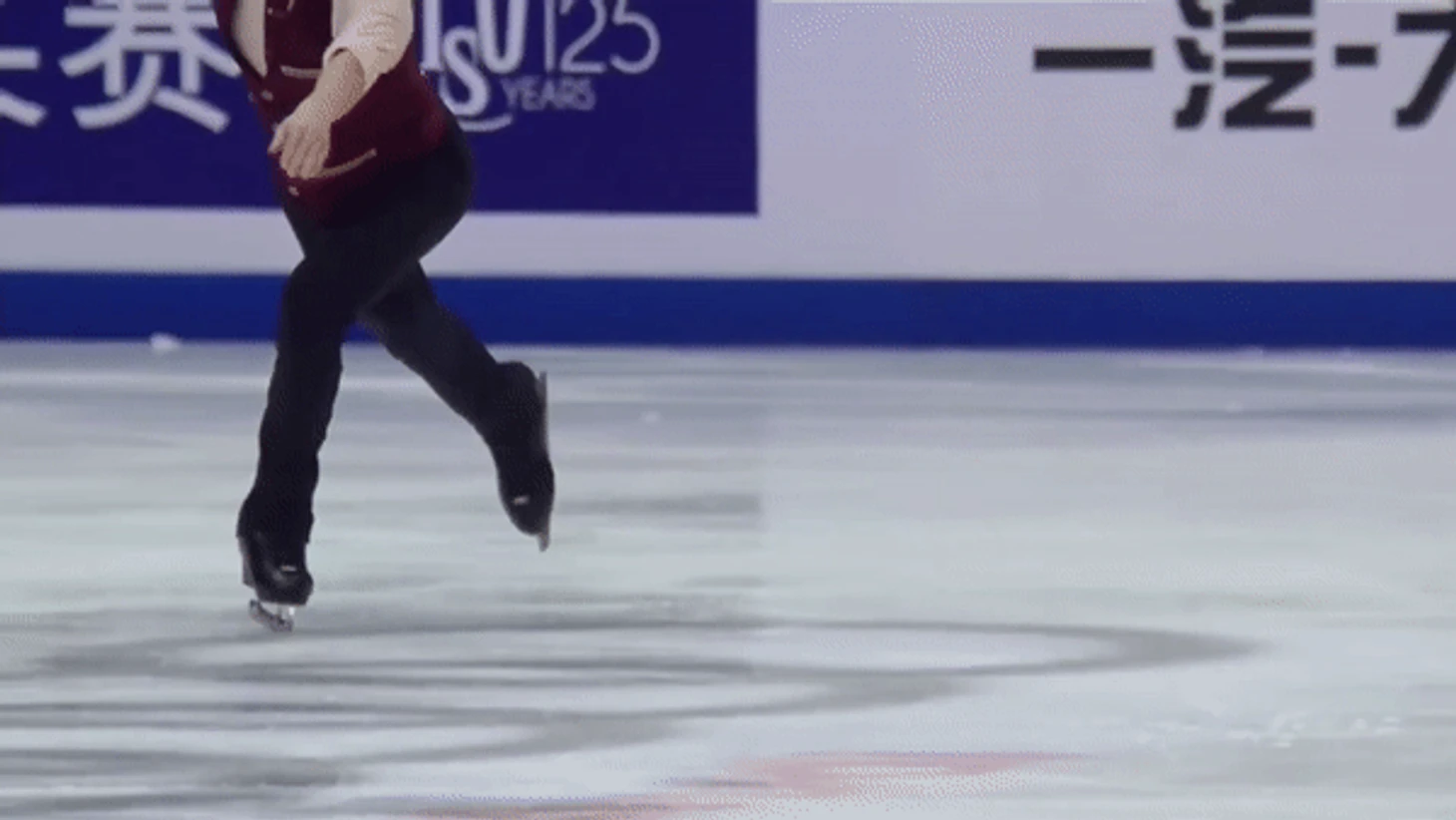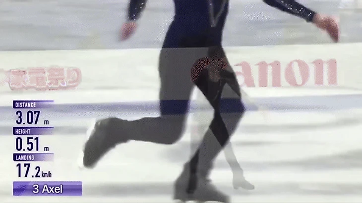 Смотрите внимательно, какой снег летит от какого именно конька. Небольшой снежок у обоих идёт от лезвия левого конька – низкий дымчатый. От носка правого конька у обоих поднимается высокий фонтан из крупных частиц льда. От лезвия правого конька снег тут не заметен. Отличий в том, как летит снежок у обоих, практически нет, характер ледовой крошки одинаков. Единственное различие прыжков – в величине предокрута, у Бояна чуть менее четверти, у Жу - половина.