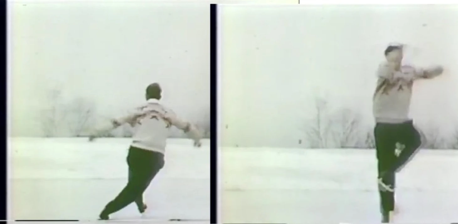 Как видно, что после удара и поворота носка, поднимается высокий фонтан снега из крупных частичек, конёк поворачивается и близко проходит ко льду, снег от лезвия явно не летит – очевидно, так как нет достаточного для рёберного толчка взаимодействия ребра со льдом.
