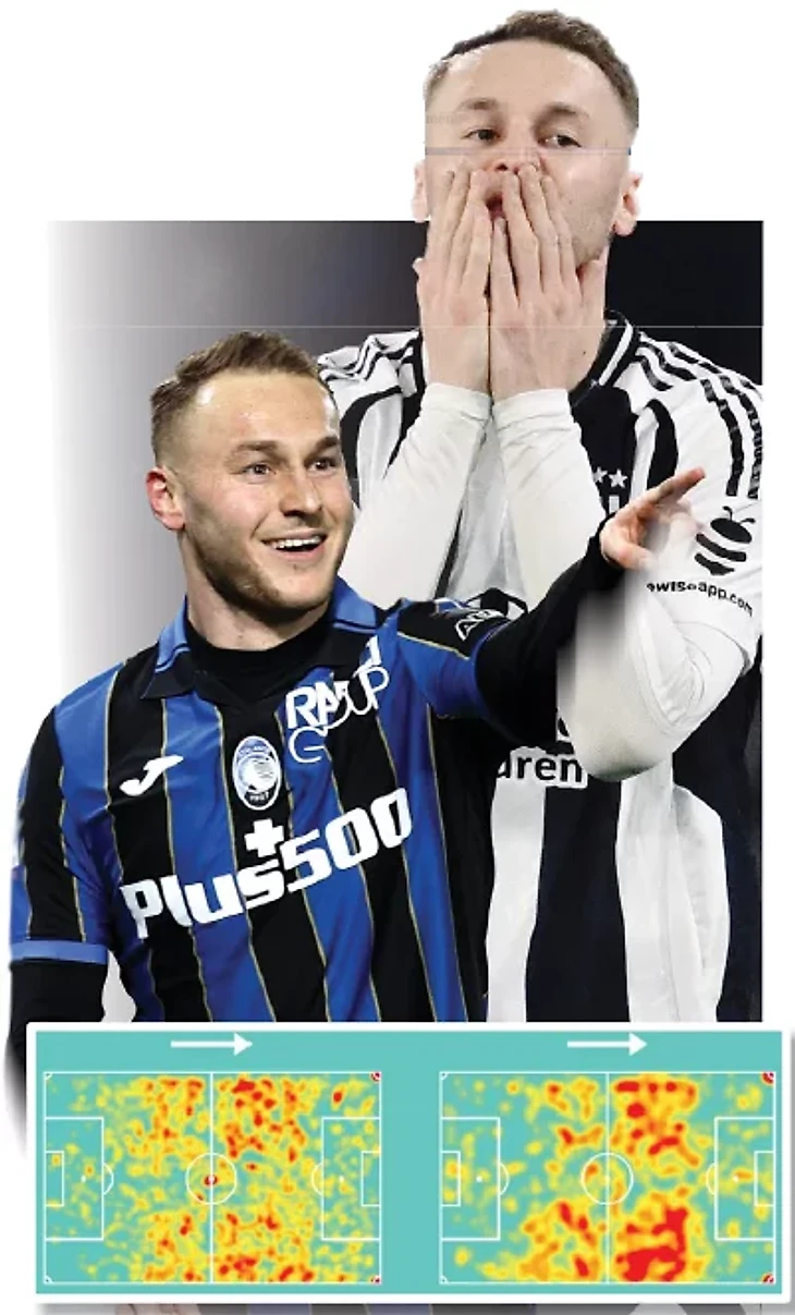 Чтобы разобраться, я сравнил его статистику с прошлым сезоном. Судя по «тепловым картам», серьезных отличий в его расположении на поле нет. Однако показатели эффективности заметно упали. В «Аталанте» процент голов по отношению к ударам в створ составлял 22%, тогда как в «Юве» — всего 3%. В сезоне 23/24 он забил 15 мячей, а в прошедшем дебютном сезоне у него только 5 голов.