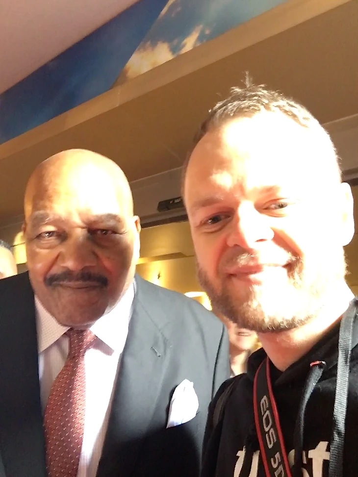 Не знаю, хорошо это или плохо, но я добрался до отеля, где проходило мероприятие, в момент, когда все звезды начали расходиться. С главного входа отеля Мариотт Маркис группами по три-четыре человека выходили пожилые люди в золотых пиджаках. Никакой охраны, лимузинов и толп фанатов. Звезды прошлого спокойно садились в Убер и уезжали в свои гостиницы. Я зашел в лобби Мариотта и тут же увидел Джима Брауна – футболиста №2 в списке самых великих игроков НФЛ за всю историю. Мистеру Брауну 82 года, но он прекрасно понимает, как делаются селфи. В отличии от взволнованного меня и фронтальной камеры моего телефона.