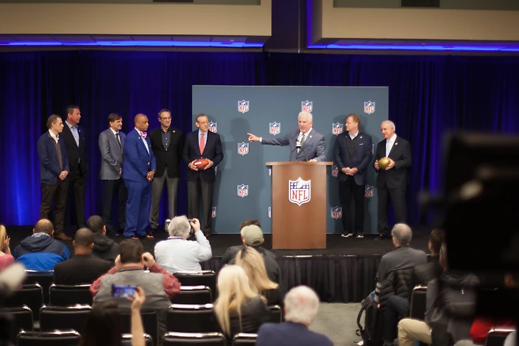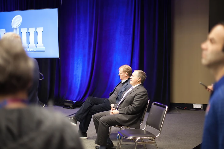 Перед пресс-конференцией происходит представление города-хозяина следующего Супербоула. Им будет Майами. На сцене футбольные и муниципальные функционеры из Флориды (среди них владелец команды Стивен Росс, мэр округа Майами Дэйд Карлос Хименес и великий Дэн Марино) рассказывают, какой прекрасный у них город и какой чудесный Супербоул нас ждет. «Если вы не были в Майами 10 лет, знайте – сейчас у нас все по-другому! Это чистый, безопасный и дружелюбный город! Мы ждем вас в 2020 у нас!» — вот основной посыл функционеров из Флориды.