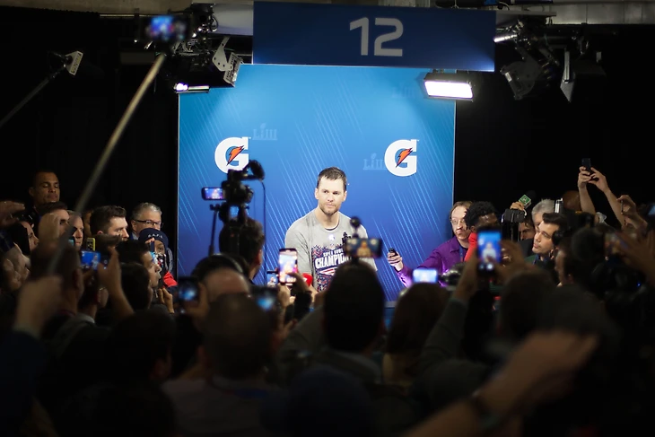 Начинаю движение из зала «Пэтриотс» в зал «Рэмс» и встречаю Тома Брэди. Он вдруг решил после общей пресс-конференции пообщаться с журналистом «радио НФЛ» отдельно. Я включаю на телефоне диктофон и подношу его к Тому. Можно сказать, что теперь он дает комментарии First and Goal! Буквально через минуту набегают журналисты и оттесняют меня от Брэди. Я делаю фото на память и захожу в зал «Рэмс». Тут грустно и малолюдно. Разделять эмоции с проигравшими никто не хочет.