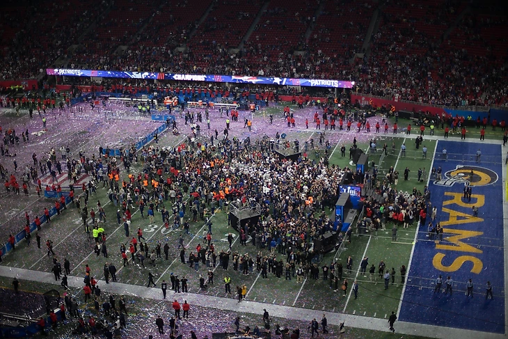 Я приехал на Супербоул за 2 часа до его начала. Особой давки на входе не было, все организовано четко и понятно. Как только попадаешь за первый кордон – публика внутри сразу преображается. Вместо модных развеселых цветных Атланты ты видишь в большинстве своем сытых потомков англосаксов. В каком-то смысле, это цвет нации. Дорого и качественно одетые, ухоженные, довольные жизнью американцы. Кажется, тут процент болеющих за «Новую Англию» еще выше, чем снаружи. Косвенное подтверждение тому – полотенца, которые раздают добровольцы на тейл-гейте. Полотенца в цветах «Рэмс» отдают хоть по 10 штук в одни руки – все зависит от вашей наглости и желания окупить входной билет. Полотенца в цветах «Пэтриотс» днем с огнем не сыщешь. Я поинтересовался у добровольцев – изначально бесплатного мерча каждой команды было поровну, но спрос на «Пэтриотс» был куда выше и их быстро размели. «Поэтому возьмите «Рэмс», сэр».