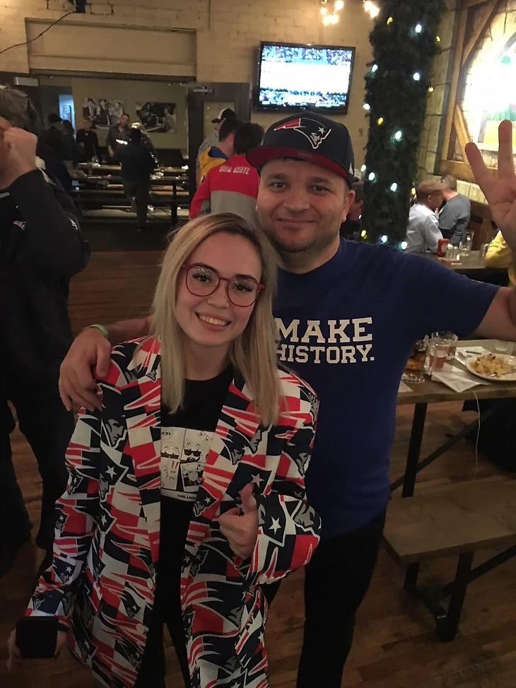 Ошибка была в том, что в выходной на это мероприятие пришло намного больше людей, чем в пятницу. Соответствующим образом увеличились и очереди к аттракционам и активностям. Так, например, чтобы сфотографироваться с трофеем Ломбарди, нужно было отстоять в очереди минимум час. В пиковые моменты – два. Ситуация осложнялась тем, что обладатели SBXTRA-билета получали приоритетный доступ к активностям за дополнительные 55$ в день и делали примерное ожидаемое время в очереди для простых смертных трудно прогнозируемым. Кстати, все подобные билеты были разобраны. Тем не менее, стоять в очередях было порой даже веселее, чем непосредственно посещать сами аттракционы, ведь компанию тебе составляли такие же сумасшедшие любители футбола. Это было самое непосредственное и веселое общение, которое я получил за время поездки. Так я узнал, что Митч Трубиски – франчайз-квотербек, Ник Фолс круче Карсона Венца, в Атланте больше всех ненавидят «Сэйнтс», а на Супербоуле будет достаточно скучная атмосфера. Почему? Потому что туда ходят по большей части мажоры, которые не умеют или ленятся болеть. А настоящие «трушные» фанаты, как правило, не готовы отдать 3500$ за билет. Но это касается далеко не всех. Например, читатели First and Goal Петя и Юля специально приехали из Кишинева, чтобы увидеть своей третий Супербоул, ведь в нем опять играют их любимые «Пэтриотс»!