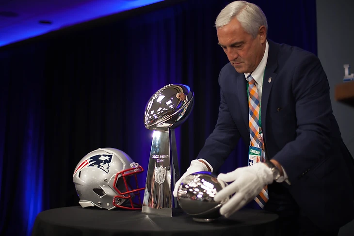 Через пять минут специально обученный человек в белых перчатках выносит на сцену шлем «Пэтриотс», трофей Ломбарди и приз MVP. Аккуратно стирает с них все отпечатки и расставляет в композицию.
