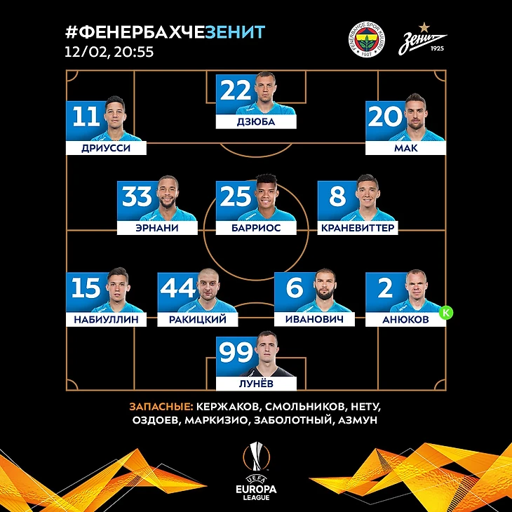 Во вторник на матч с Фенербахче Сергей Богданович выпустил обороняющийся состав. Выпустив двух опорников: Краневиттера и Барриоса. Эрнани, человек, который хорошо подключается вторым темпом, бьет издали и может обострить. Выпуская эту тройку Семак хотел максимально эффективно сидеть в обороне и за счет Дриусси и Мака выбегать в контратаки. На правом фланге турков защитник Исла агрессивно ходил в атаку. Мозес и Вальбуена напрягали защитников Зенита, но большую нагрузку потерпел фланг Набиуллина.