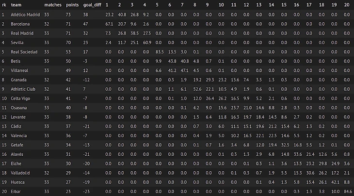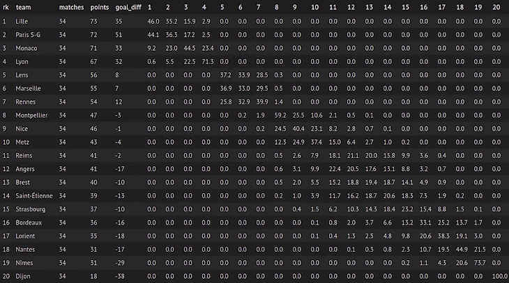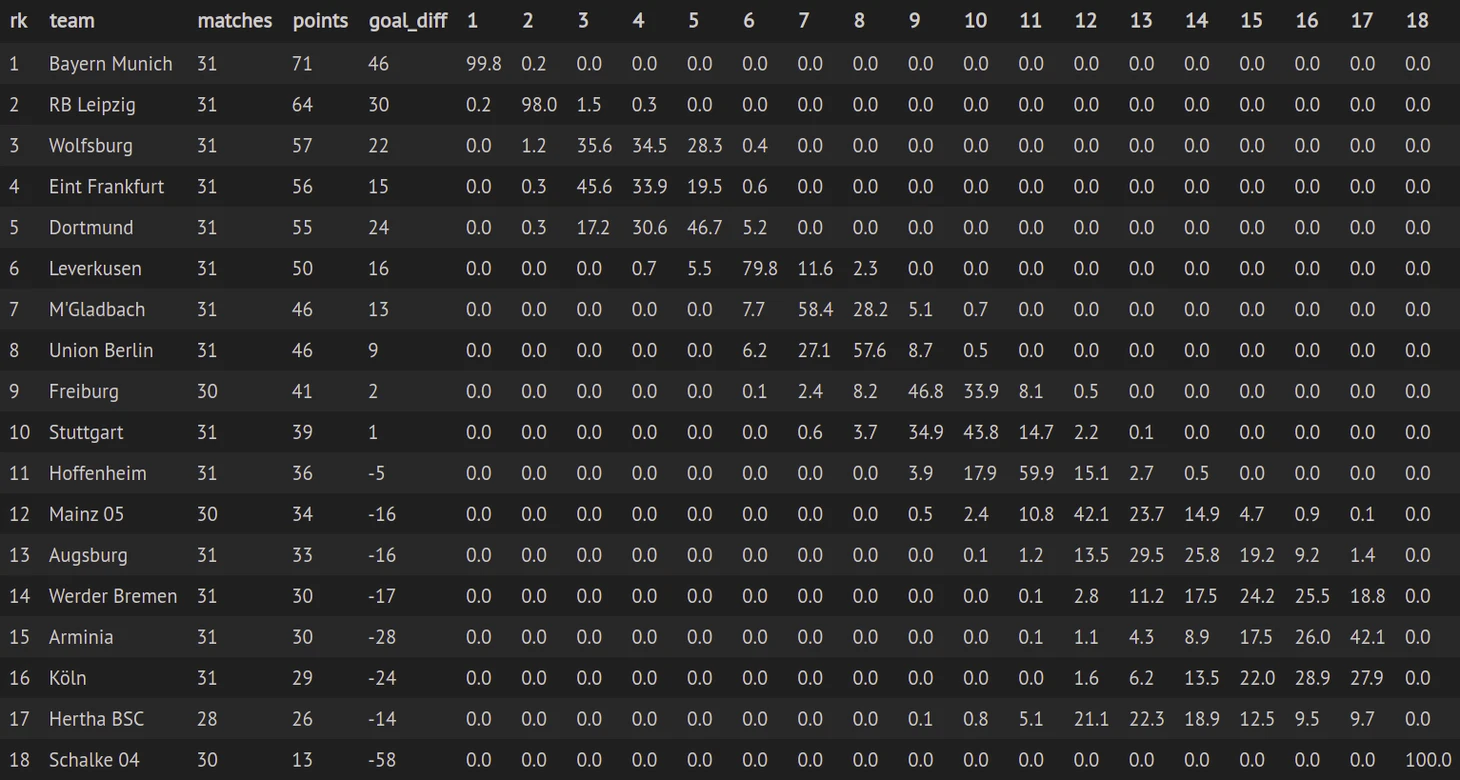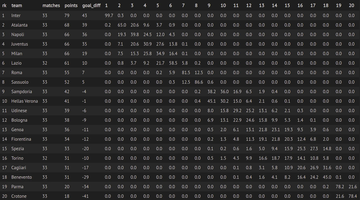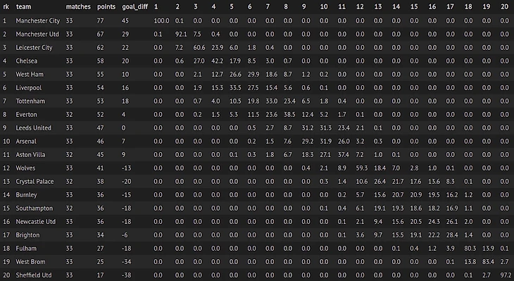 У нас есть прогнозы на будущие матчи, на которых запускаем метод Монте-Карло. Генерируем случайное число от 0 до 1. Если это число меньше вероятности победы, то засчитываем команде победу, если больше вероятности победы и меньше суммы вероятностей победы и ничьи, засчитываем ничью, в случае если случайное число превышает сумму вероятностей победы и ничьи, то поражение. Повторяем этот процесс 50 000 раз и считаем, сколько раз команда заняла каждое из мест. В результате мы получим вероятность занять определенное место для каждой из команд.