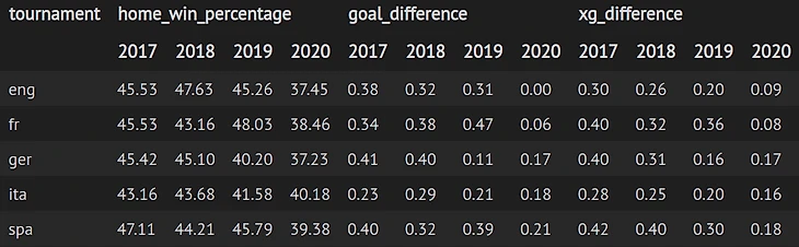 Видим, что в текущем сезоне во всех чемпионатах просел процент побед домашней команды, а также средняя разница в счете и в xG относительно хозяев поля.