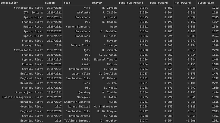 Дело за малым: осталось применить модель машинного обучения и научиться предсказывать EPV на основе признаков, описывающих ситуацию на поле, подстраиваясь под PV. После этого сложим все награды за улучшение владений и наказания за потери мяча для каждого игрока по каждому сезону и поделим полученные суммы на чистое игровое время, проведенное футболистом на поле. На основе полученных значений можно сформировать рейтинг игроков. В таблице представлены игроки, сыгравшие хотя бы 1000 чистых минут за сезон. pass_run_reward — суммарные награды/штрафы за передачи, обводки и ведения мяча, pass_reward — только за передачи, run_reward — только за обводки и ведения мяча. Награды пересчитаны на 60 минут чистого игрового времени.