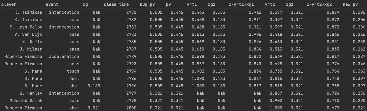 Для наглядности разберем одно из владений Ливерпуля в прошлом сезоне. Здесь xg — это xG удара, clean_time — чистое время события в секундах, bug_pv — это то, как мы убого считали PV в прошлой статье, pv — это PV без фактора дисконтирования, y^t1/y^t1 = 0.95 ^ время до первого/второго удара, xg1/xg2 — xG первого/второго удара, new_pv — PV с фактором дисконтирования, равным 0.95.