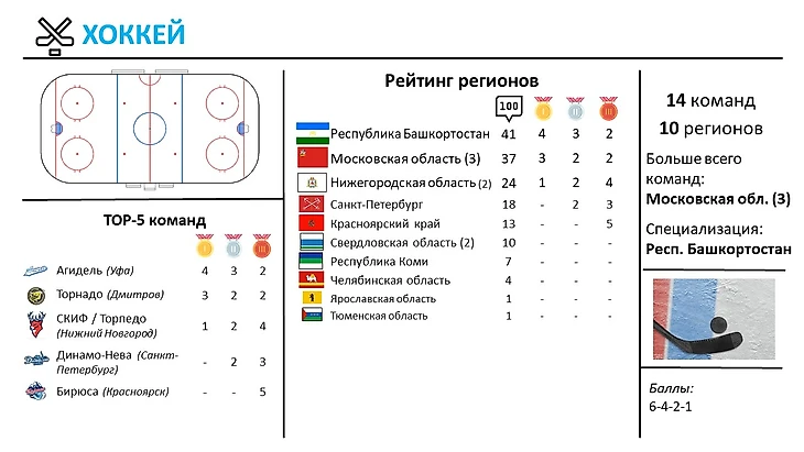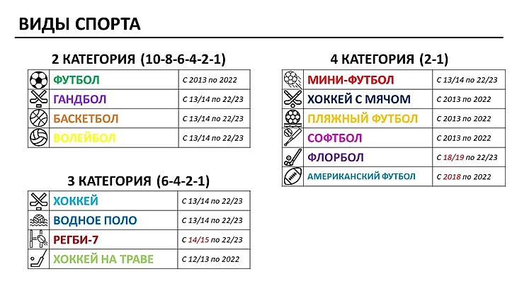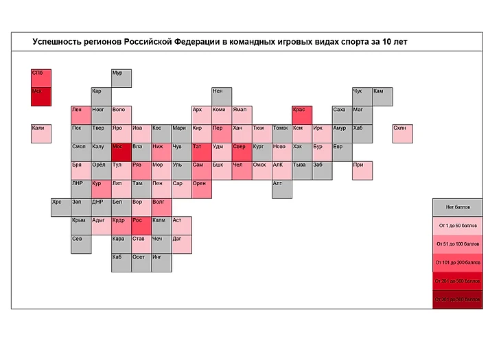 Временной период: для понимания действительного рейтинга регионов нужна некоторая дистанция, это позволит исключить влияние случайностей и отдельных слабых сезонов. Поэтому я брал данные за последние 10 сезонов (при наличии таких данных, отсутствие выделено красным), конкретный период для каждого вида спорта указан выше.