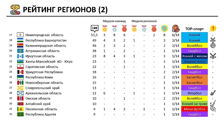Медали посчитаны как призовые места в 14 видах спорта согласно полученному рейтингу в конкретном виде спорта;