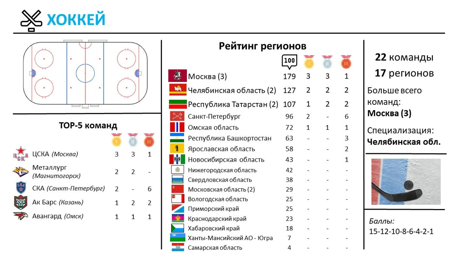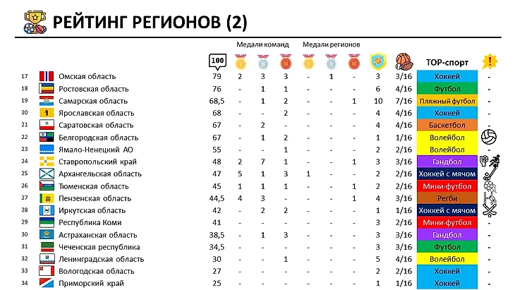 Временной период: для понимания действительного рейтинга регионов нужна некоторая дистанция, это позволит исключить влияние случайностей и отдельных слабых сезонов. Поэтому я брал данные за последние 10 сезонов (при наличии таких данных, отсутствие выделено красным), конкретный период для каждого вида спорта указан выше.