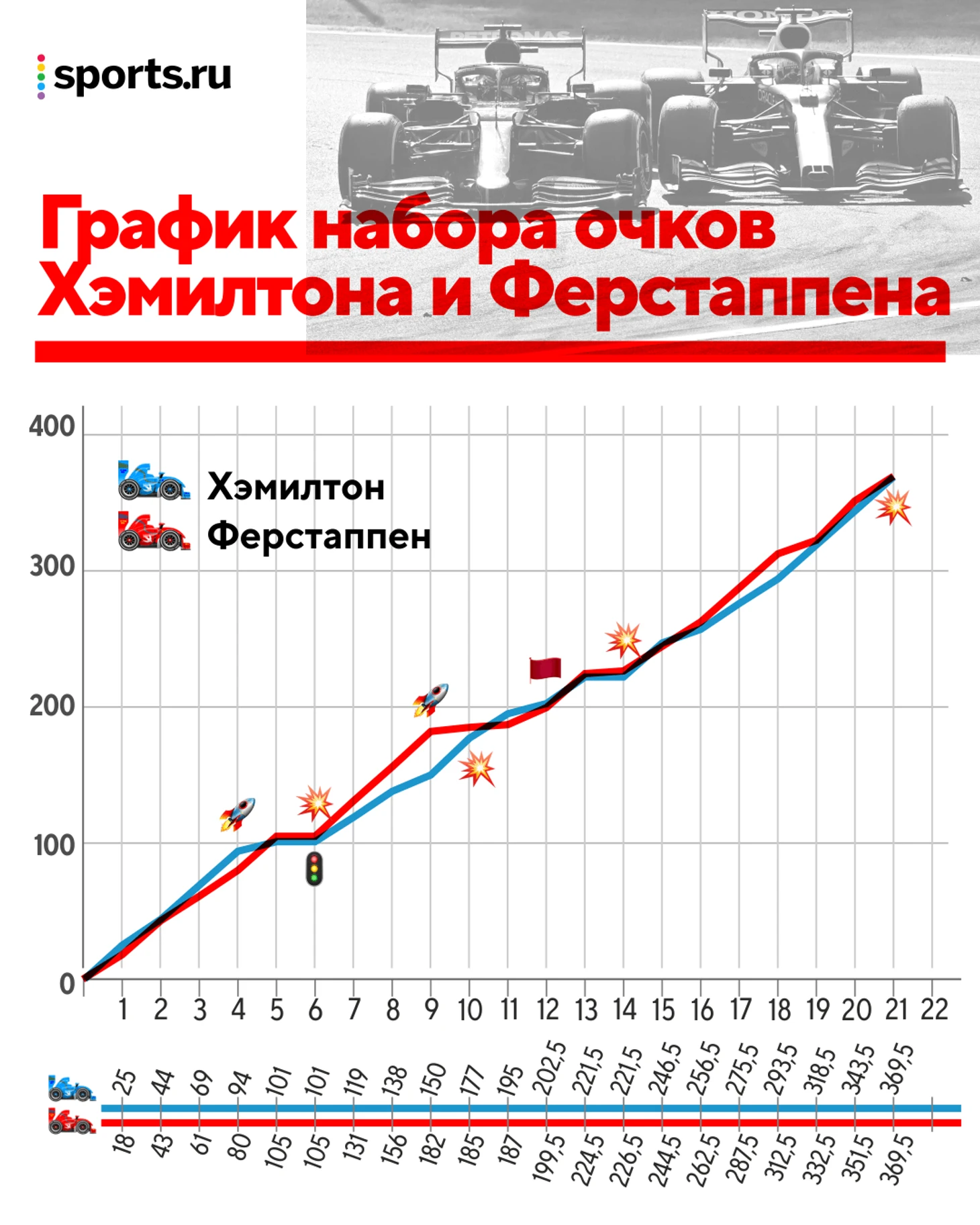 Перед важнейшим Гран-при Макс Ферстаппен из «Ред Булл» и Льюис Хэмилтон из «Мерседеса» набрали по 369,5 баллов.