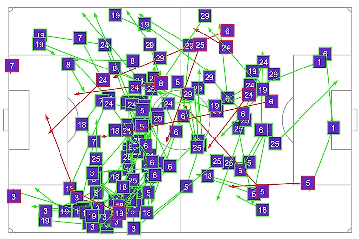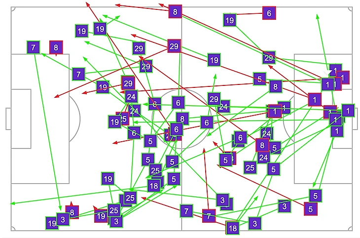На скрине выше все передачи «Челси» с игры в первую тридцатиминутку. Здесь можно подчеркнуть две особенности: