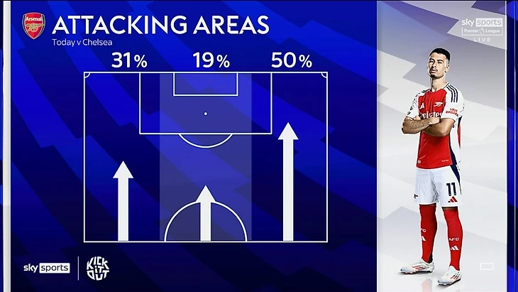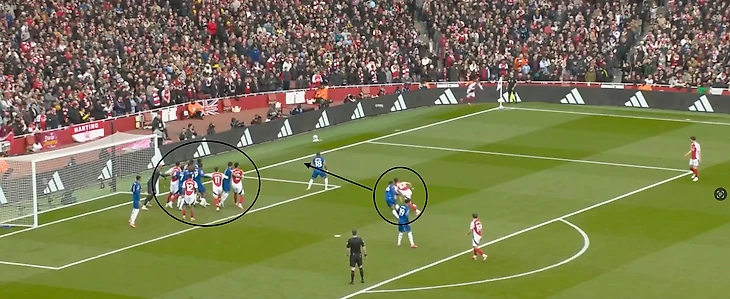 На скрине выше видно, что основные силы сдерживания «Челси» сконцентрировал в центре штрафной на Габриеле и Салиба, что выглядит логично - они основные адресаты подач. Все игроки сгрудились в штрафной, перекрыв Санчеса, и поэтому совсем упустили набегающего из глубины на ближнюю Мерино, который не обижен природой в своих габаритах и тоже может, и умеет играть в верховые мячи.