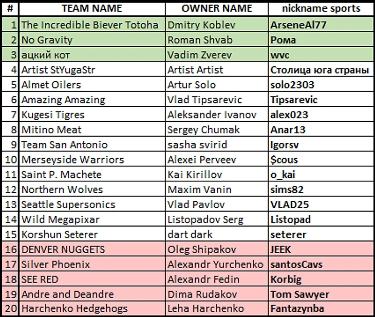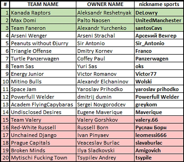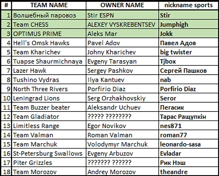 (включает данные об данных участника на ESPN, sports.ru, e-mail, telegram и статусе игрока перед сезоном 2018/19: новичок или участовал в прошлом сезоне)