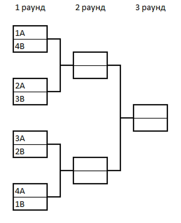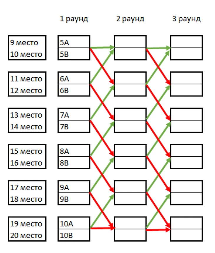(выигравшие раунд передвигаются в блоках по зеленой стрелке, проигравшие - по красной):
