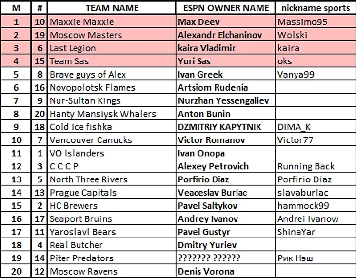 Если победит вариант с регуляркой на 11 недель, то на 10 и 11 туры будут 2 варианта: соперники рандомом заранее до начала драфта, либо матчи в 10 и 11 туре пройдут между командами занимающими соседние места: 1-2, 3-4 и т.д. Пары будут выставляться каждый понедельник вручную после подсчета ESPN итогов предыдущего тура (примерно 13-14 часов мск.)