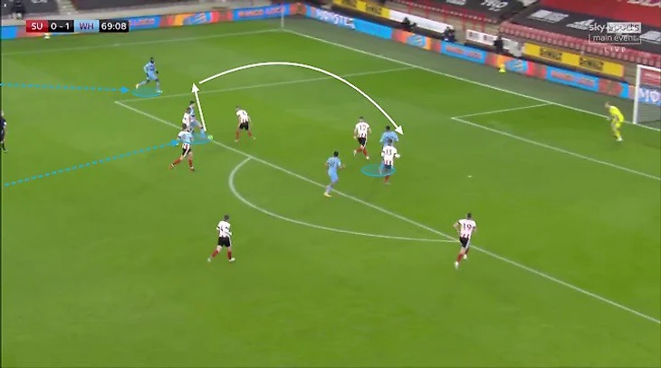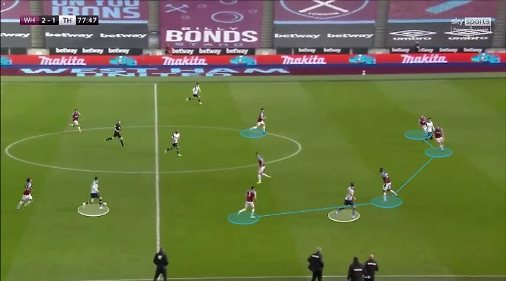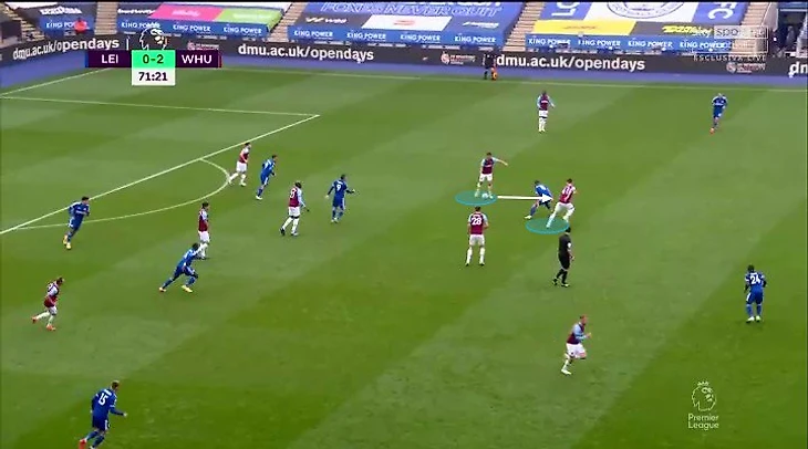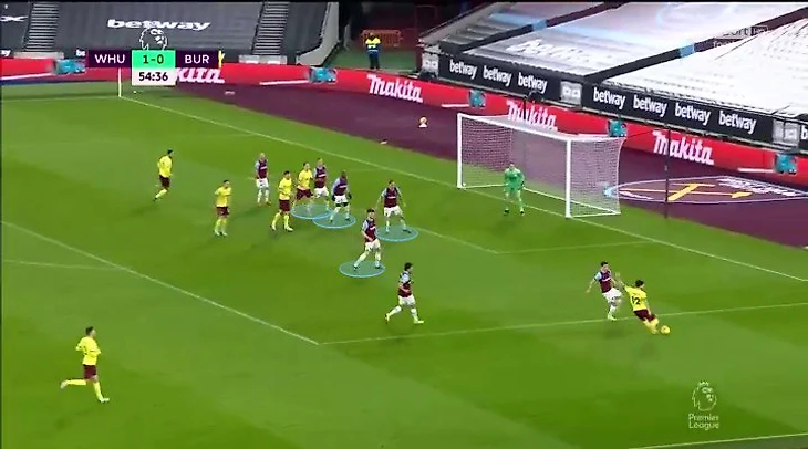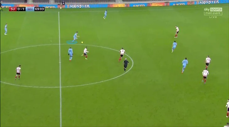Похожая ситуация чуть позже. Райс встречает МакНила, а Соучек вновь становится дополнительным центральным защитником. Но отметим, что в этом случае Макнил заметил открывшегося Барнса, хотя и не смог выполнить точную передачу. Тем не менее, это демонстрирует, что центральные полузащитники «ВХЮ» нацелены на усиление оборонительной линии, пусть это и оставляет дыры на месте их «обычных» позиций. (*самый яркий пример можно увидеть в последнем матче с «Сити». В моменте второго гола в центре не оказалось игрока, который бы закрыл коридор для передачи)