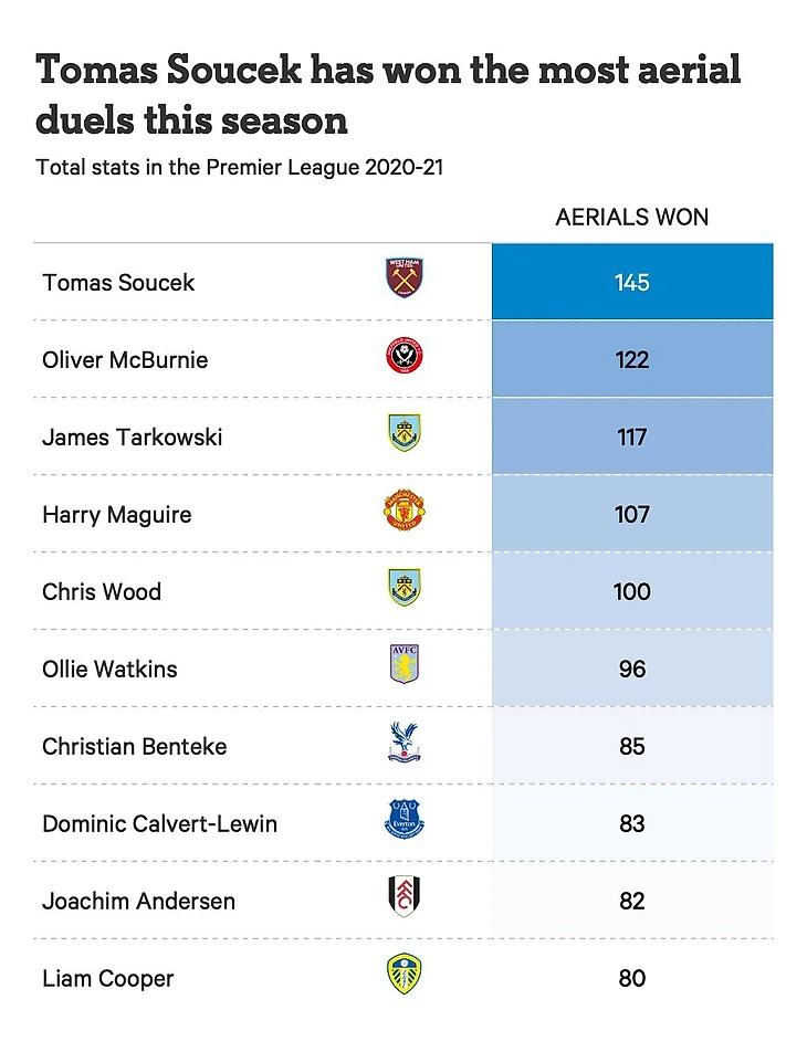 Лучше всего об игре «Вест Хэма» говорит совсем не примечательная победа над «Бернли» в середине января со счетом 1:0. Тогда лондонцы забили на 9 минуте и отдали мяч «Бернли», который установил собственный рекорд по владению мячом в сезоне. И хотя их подход, с забросами на Вуда и Барнса, остался прежним, «Вест Хэм» выстоял во многом благодаря Райсу и Соучеку, которые отлично подстраховывали своих центральных защитников. Их решимость в верховой борьбе была важна как никогда: Соучек выиграл 10 воздушных единоборств, больше всех в матчах, Райс выиграл 5. Вуд и Барнс выиграли по 4, столько же выиграл Огбонна, еще одно единоборство выиграл Доусон. В матче где особенно важно было овладеть вторым этажом, главные орудия для этого оказались у «Вест Хэма».