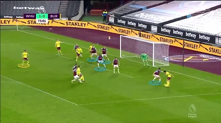 Вот хороший пример. «Бернли» атакует правым флангом, Райс стережет ближнюю штангу, а Соучек опустился за спину Огбонне, контролируя навес на дальнюю штангу.