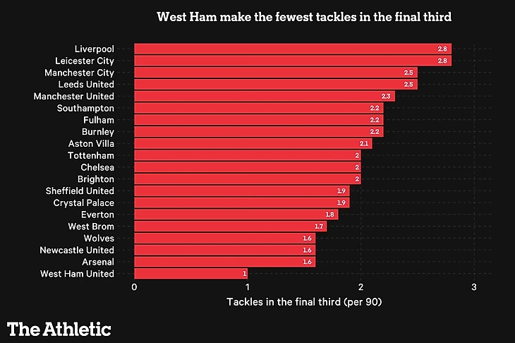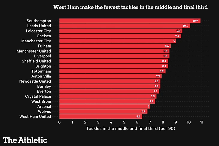 В этом сезоне «Вест Хэм» прессингует невысоко и вступает в наименьшее число единоборств на чужой трети поля.