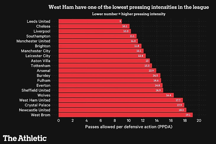 Если вас не убедило количество единоборств, то можно посмотреть на показатель PPDA, по которому «Вест Хэм» опережает только «Кристал Пэлас», «Ньюкасл» и «Вест Бромвич». Из всего этого следует ясный вывод – «Вест Хэм» «отсиживается» в обороне.