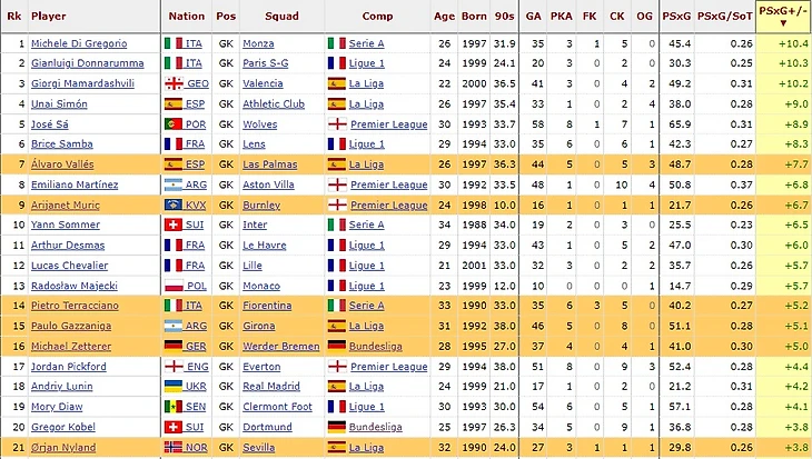 A PSxG+/- является разницей между ожидаемыми голами, и пост-ударным ожиданием. Если это значение плюсовое, то вратарь сильный. Если минусовое – слабый.