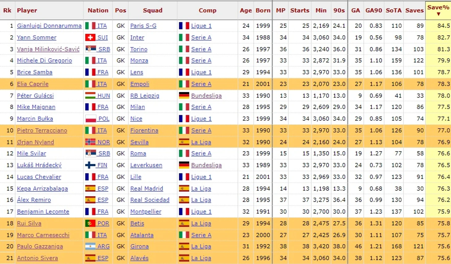 С лучшими матчами все просто: 100 % сейвов в домашних играх с «Удинезе» и «Фрозиноне», а так же с «Наполи» на выезде – по 5 сейвов. Такой же процент он выдал с «Дженоа» (4 из 4), с «Сассуоло» (3 из 3), с «Вероной» и «Эмполи» (2 из 2). В матче с «Сассуоло» он выдал интересный трюк, дважды отбив пенальти от Пинамонти.