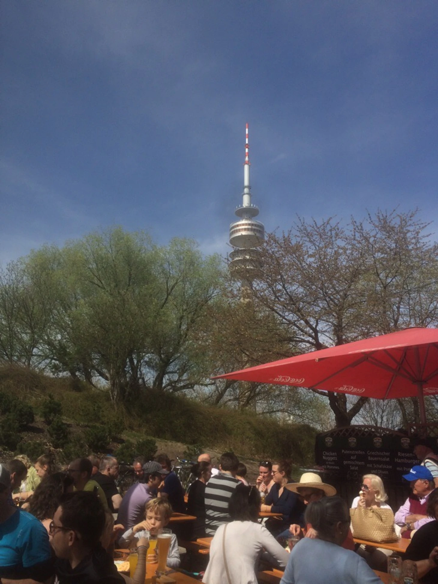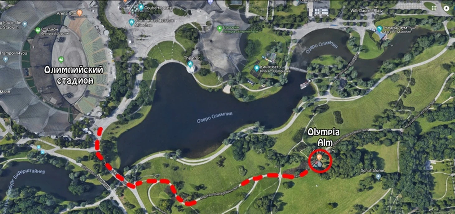 На следующий день мы отправились в «Olympia Alm», находящийся в Олимпийском парке. Это небольшая закусочная под открытым небом, найти которую не так-то просто. Ниже вы найдете скриншот карты с указанием места. Если в навигации вам больше поможет адрес, то кафе находится на Martin-Luther-King-Weg, 8.