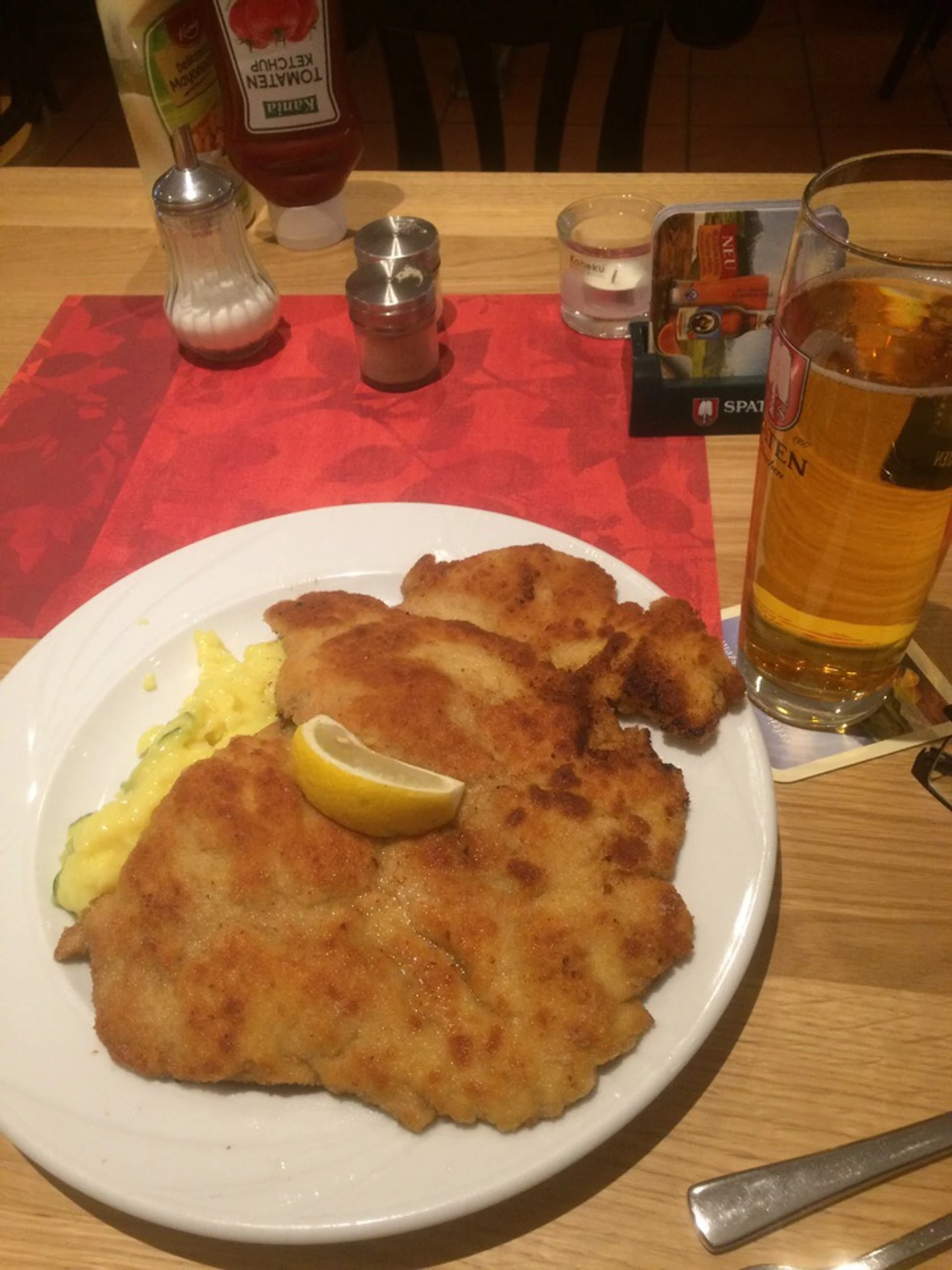 Внешне и внутренне ресторан подходит под определение «очень германисто». С местами оказалось несколько туго (субботний вечер, все хотят отдохнуть), но свой уголок мы нашли. Ограничившись овощным салатом и бокалом пива, мы немного перевели дух после продолжительного дня и отправились в отель.