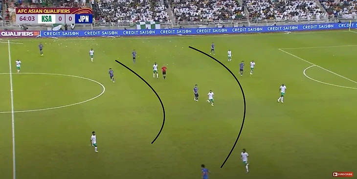 Отличительная особенность игры Саудовской Аравии - очень насыщенный центр поля. Два опорника всегда играют в оборонительном блоке, сильно прижимаясь к паре центральных защитников, между тем, атаку поддерживают из глубины и нерегулярно.