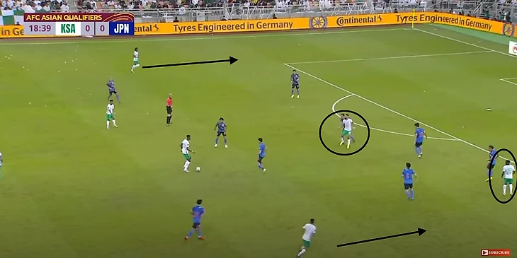 Саудовцы часто используют командный прессинг в начальном этапе атаки соперника. В качестве примера, опять же, момент из матча квалификации ЧМ против Японии. Соколы стараются контролировать все возможные варианты развития атаки, чтобы в дальнейшем "накрыть" соперника, либо перехватить передачу. К слову, с японцами такая тактика прекрасно работала.