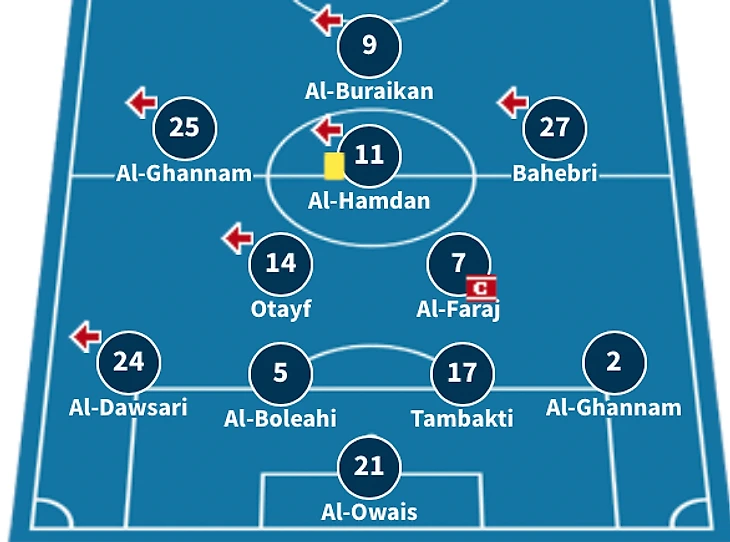 Схема игры сборной Саудовской Аравии: 4-2-3-1, иногда 4-3-3.