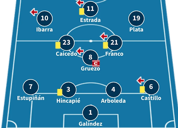 Схема игры сборной Эквадора: 4-3-3 (треугольник), реже 4-2-3-1.
