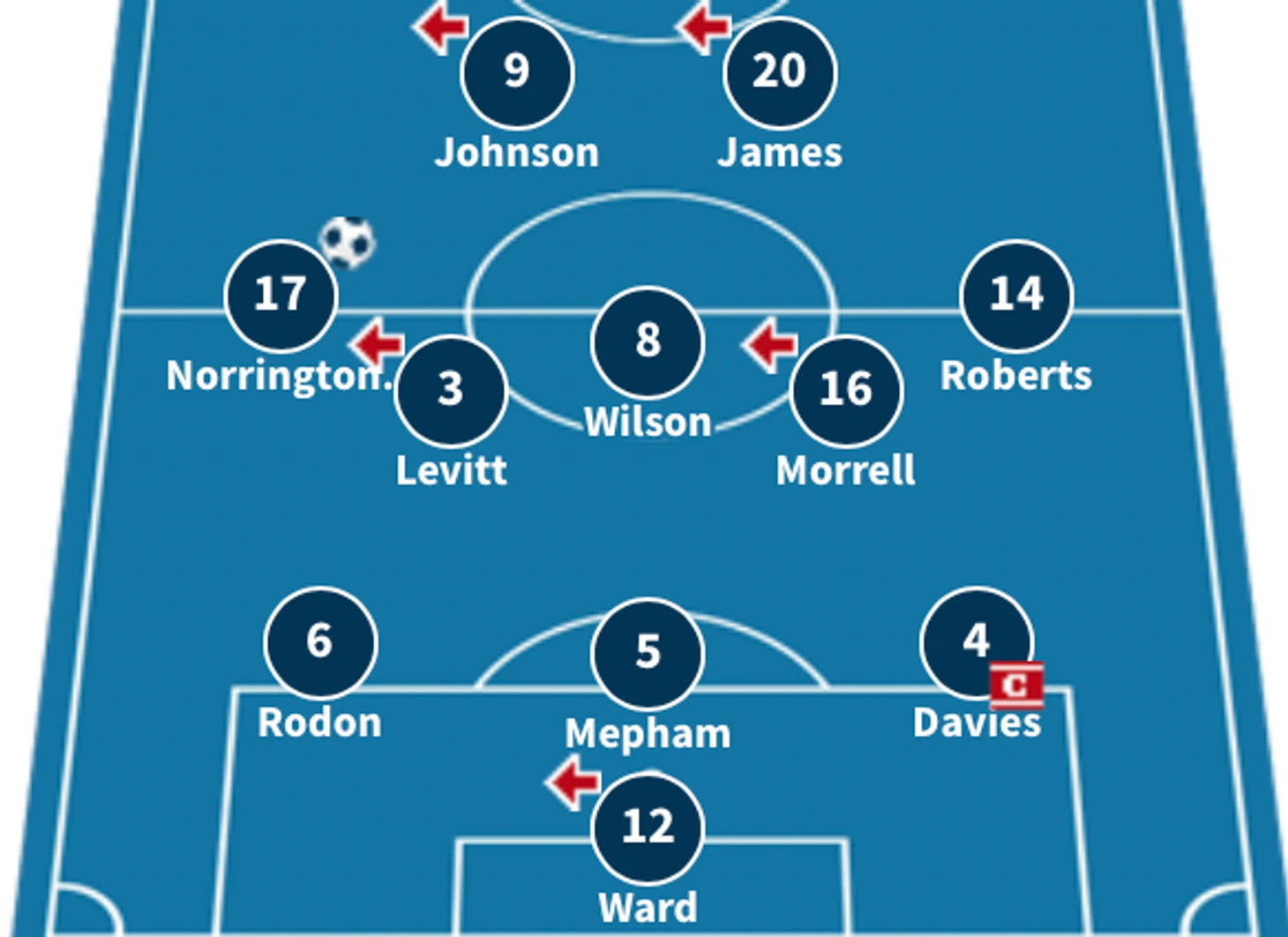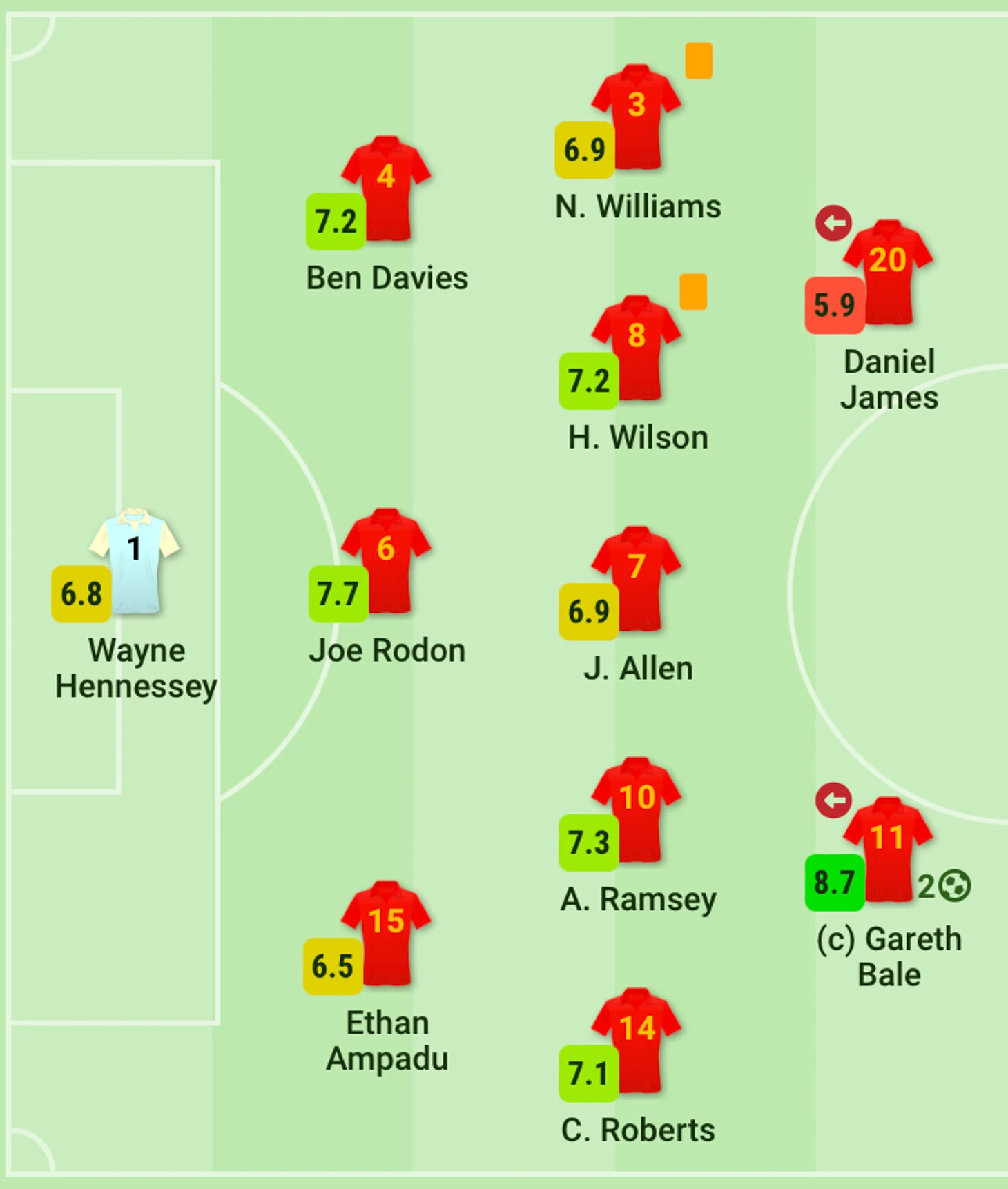 Роли Гарета Бэйла и Дэниэла Джеймса, безусловно, связаны с нападением, но это не строгое амплуа. Оба футболиста больше времени проводят в центре поля, помогая обороняться команде, а привычное расположение занимают только при позиционных атаках, которых у Уэльса очень мало.