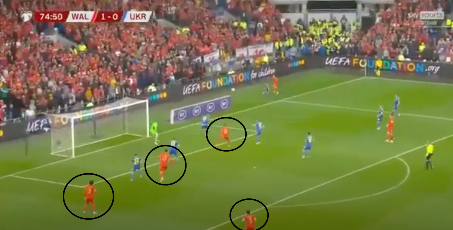 Из-за постоянных забегов крайних защитников у Уэльса случаются провалы в обороне. Не все контратаки проходят идеально, в случае перехвата мяча соперник получает численное преимущество и уже штурмует ворота Уэльса, где осталось три центральных защитника с большими разрывами между собой.