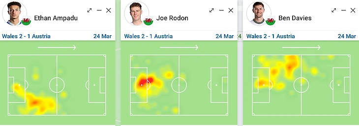 Обратите внимание на тепловые карты защитников в стыковом матче с Австрией. Из трех центральных – два играют чаще на фланге, а один, можно сказать, живет в центре штрафной.