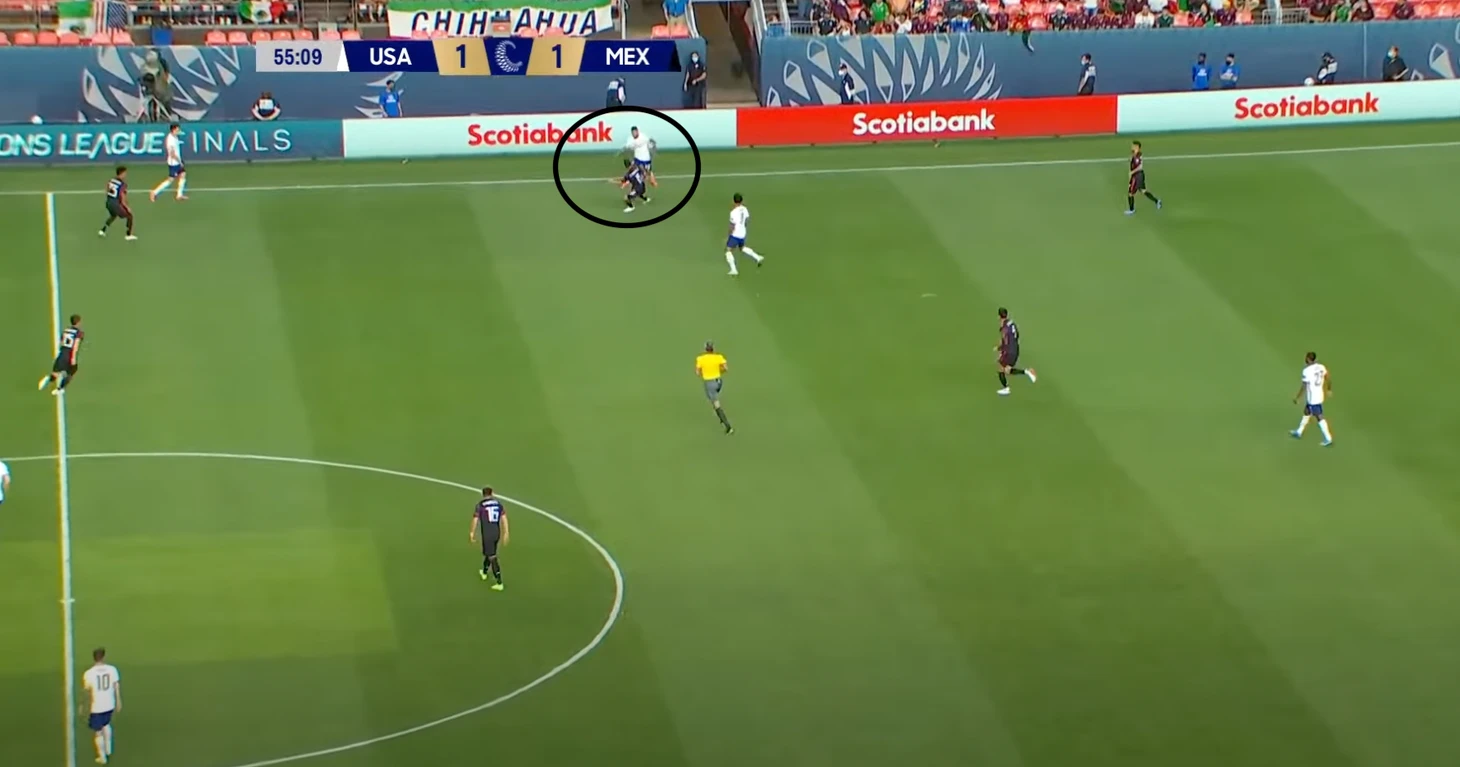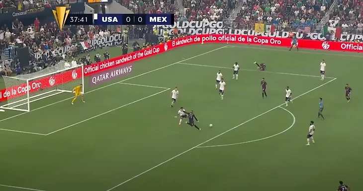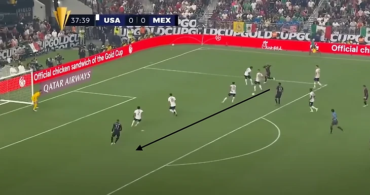 Эта сумасшедшая передача, едва, не привела к голу в ворота США. Доктрина «играй низом» работает в любой ситуации, что дает четкое представление об игре мексиканцев.