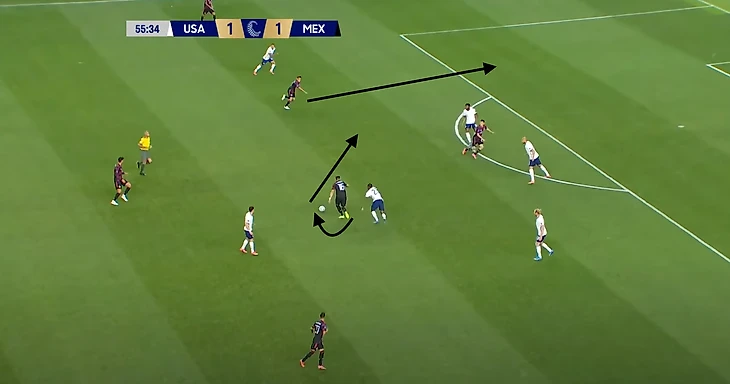 В данном моменте полузащитник мексиканцев развернул соперника, а партнер по команде мгновенно отреагировал, и начал забегание в свободную зону.