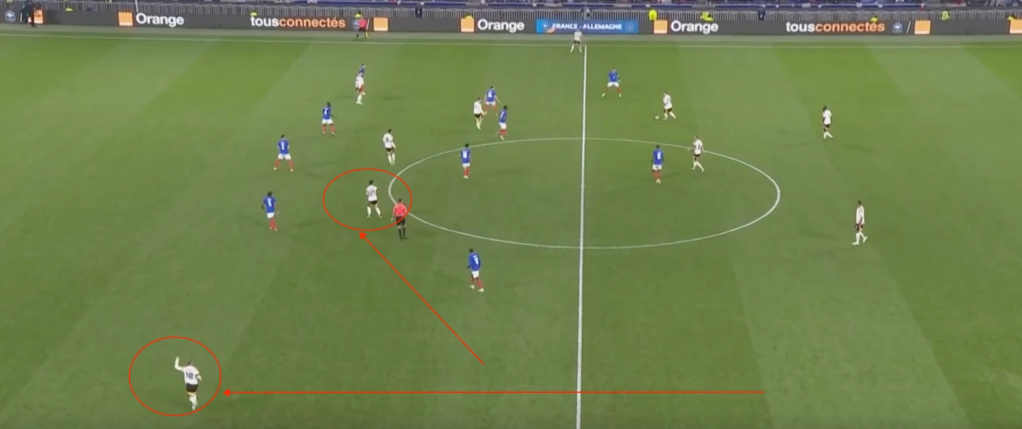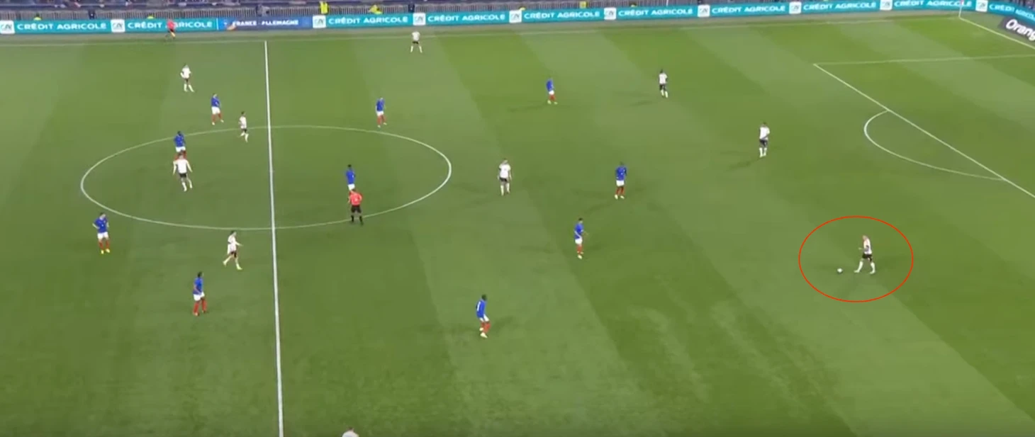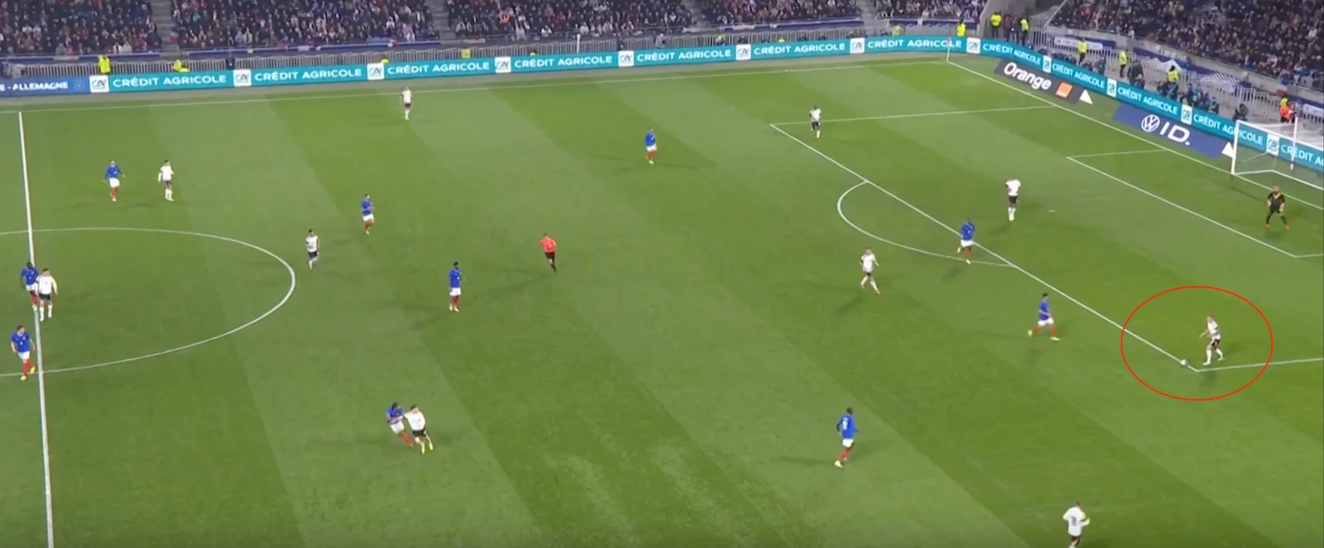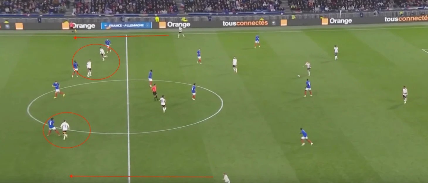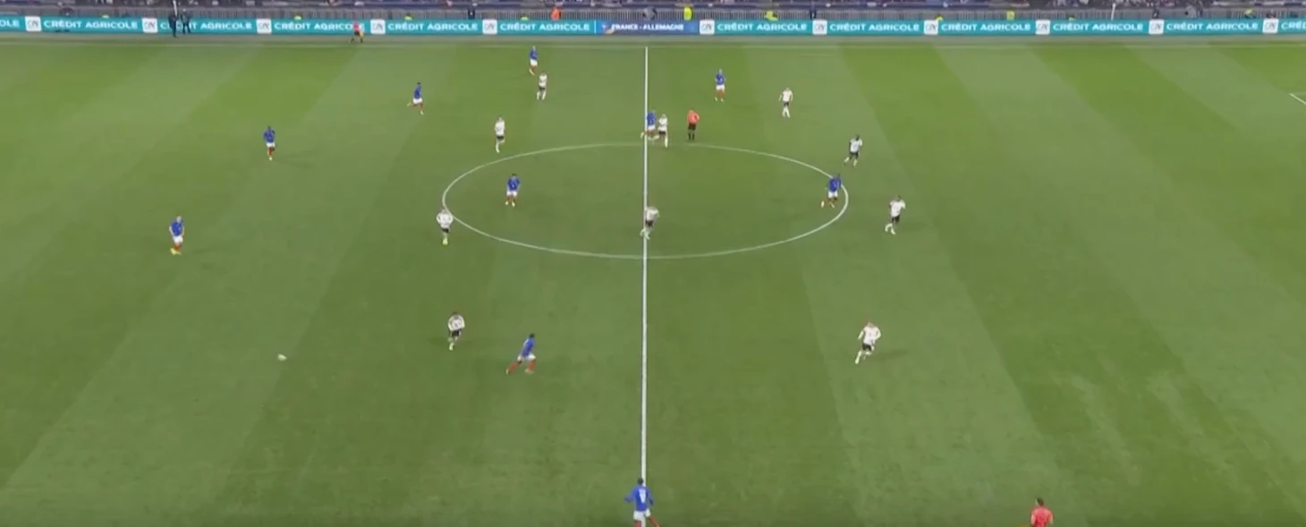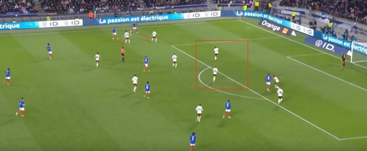 Немцы охраняют свободные зоны, что видится логичным. Но вот проблема – соперники прекрасно об этом знают, из-за чего стараются действовать непредсказуемо. Французы часто вбегали в штрафную площадь лишь в самой последней фазе атаки, когда немецкие защитники «контролировали пустоту», а расстояние до ворот позволяло нанести опасный удар в касание.