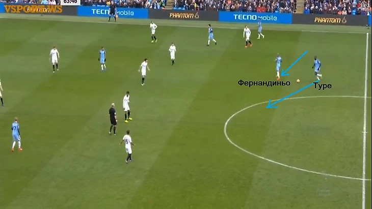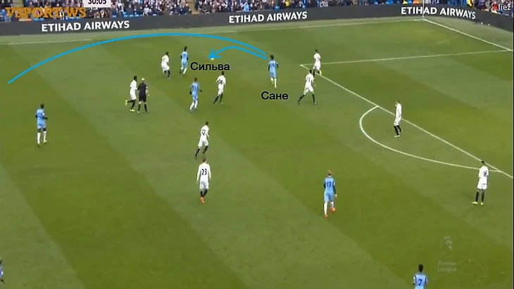 Одна из таких атак изображена на скриншоте выше: Гаэль Клиши отдает верховой пас на Лероя Сане, тот скидывает на Давид Сильву и бежит в штрафную, испанец в свою очередь за счет дриблинга проходит по бровке в штрафную и обостряет горизонтальной передачей.
