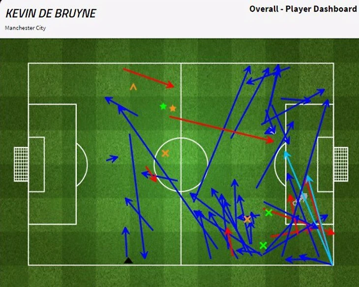 Карта передач Кевина Де Брюйне. Обратите внимание на пасы с фланга на фланг.